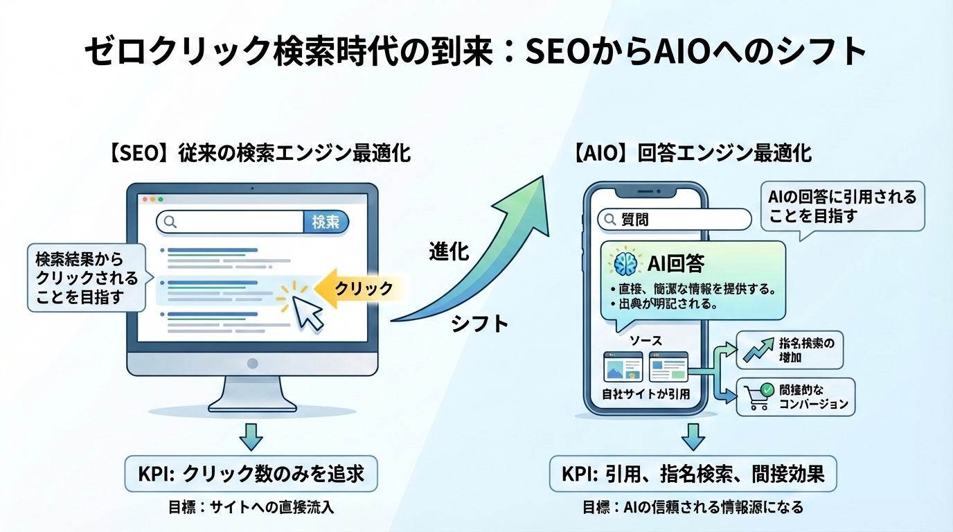 | 流入特性 | クリックが前提のトラフィック | ゼロクリックが増加し、AI直接回答が増える |