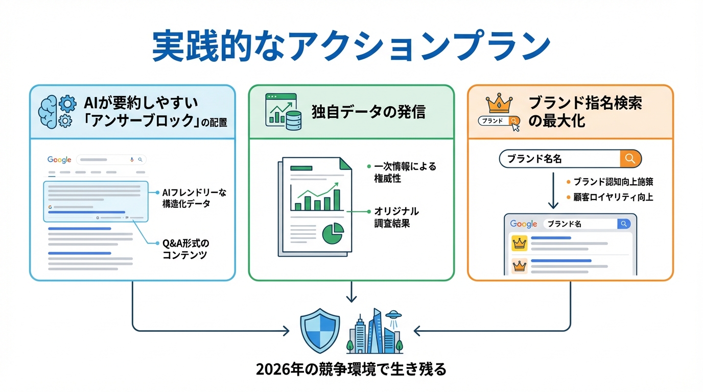 短期的にはスキーマ実装とコンテンツのAPO化でAI Overviewへの引用を狙い、中長期的にはブランドエンティティの強化とGEO戦略の全社的導入で、AI Modeがデフォルトになる将来に備えることが重要です。
