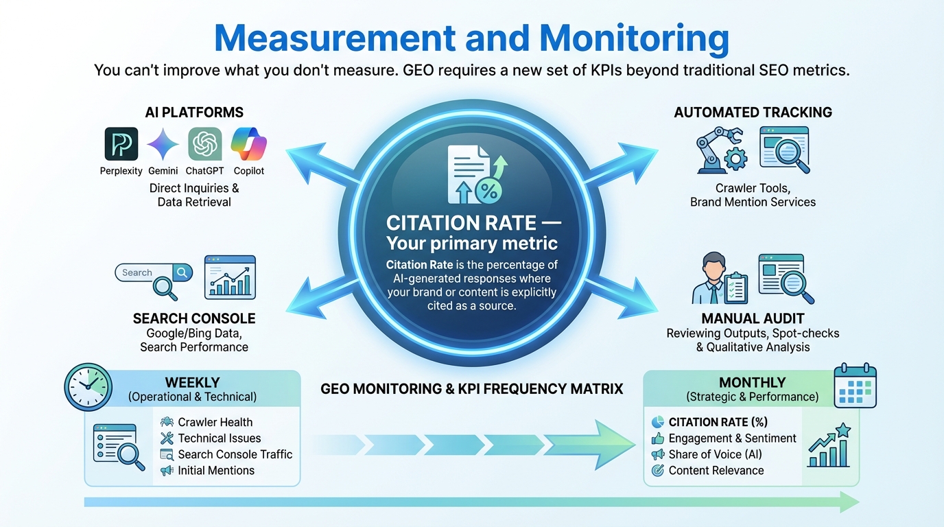 Track Citation Rate (the percentage of AI answers that cite your URL) as your primary KPI. Use tools like OtterlyAI or Rankscale for automated tracking, supplement with weekly manual prompt audits, and monitor AI crawler access in your server logs. Google Search Console's AI Overview reporting connects your data directly to Google's AI search pipeline.