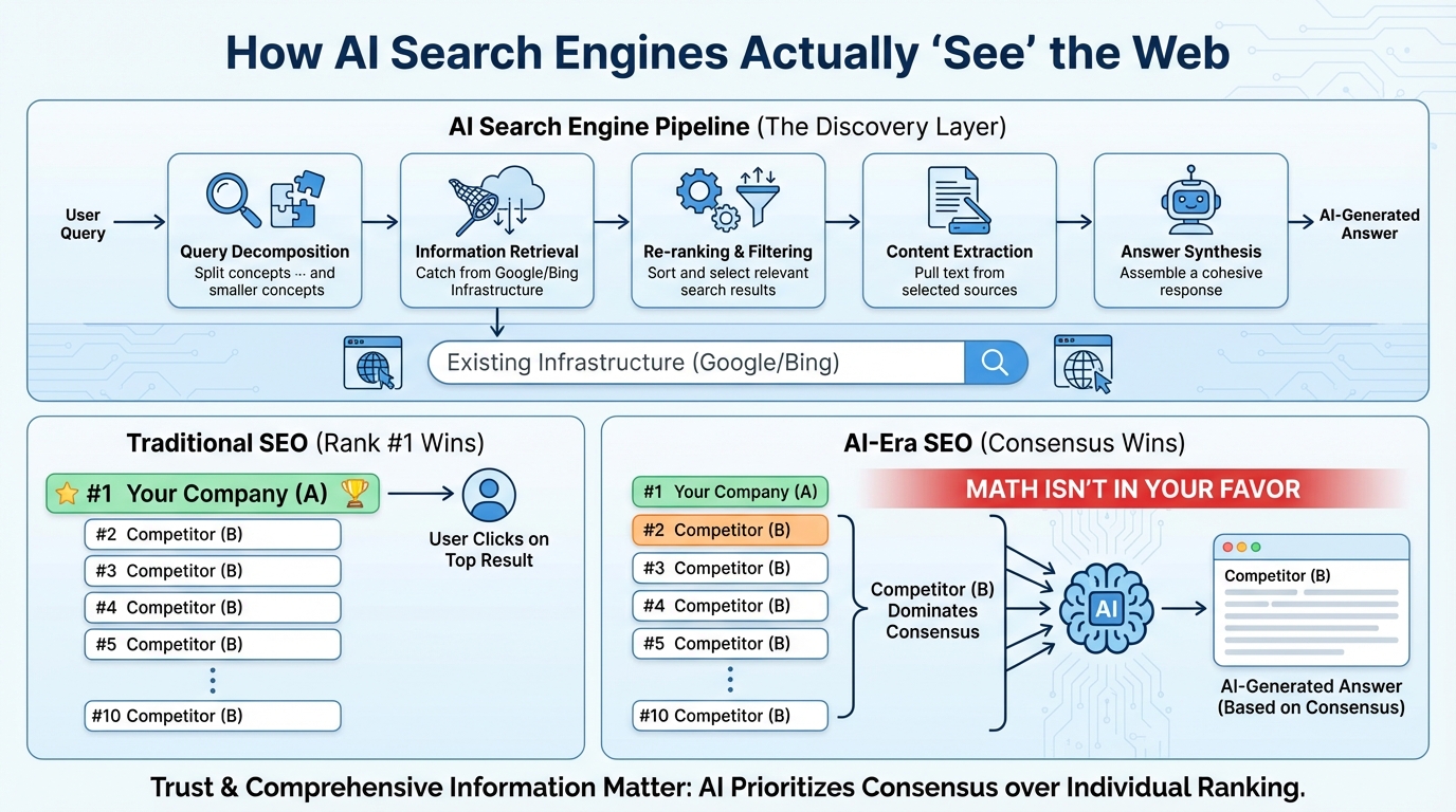 In traditional SEO, ranking first was the finish line. AI search engines, however, scan snippets from the entire first page. They look for cross-source agreement before committing a brand name to their answer.