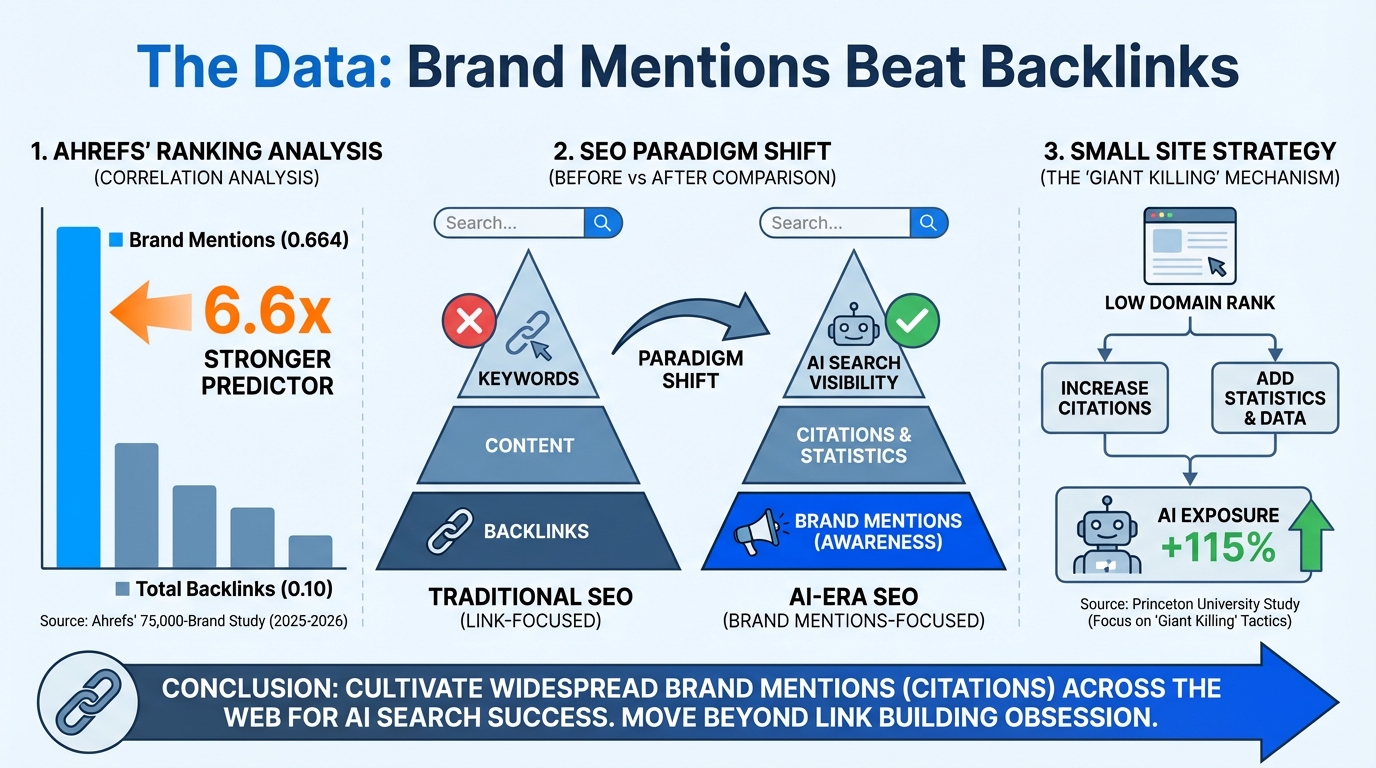 When I first saw the Ahrefs data, I was genuinely surprised — I'd expected backlinks to be a stronger factor. But the numbers tell a clear story. Multiple studies published between 2025 and 2026 confirm the same pattern. Brand mentions outperform backlinks as predictors of AI citation.