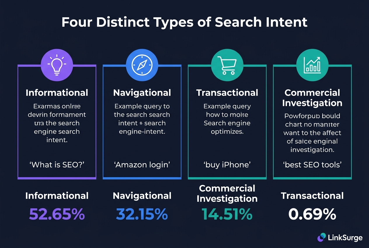 - Search intent falls into 4 categories — Informational, navigational, transactional, and commercial investigation. Understanding these categories is the foundation of modern SEO strategy