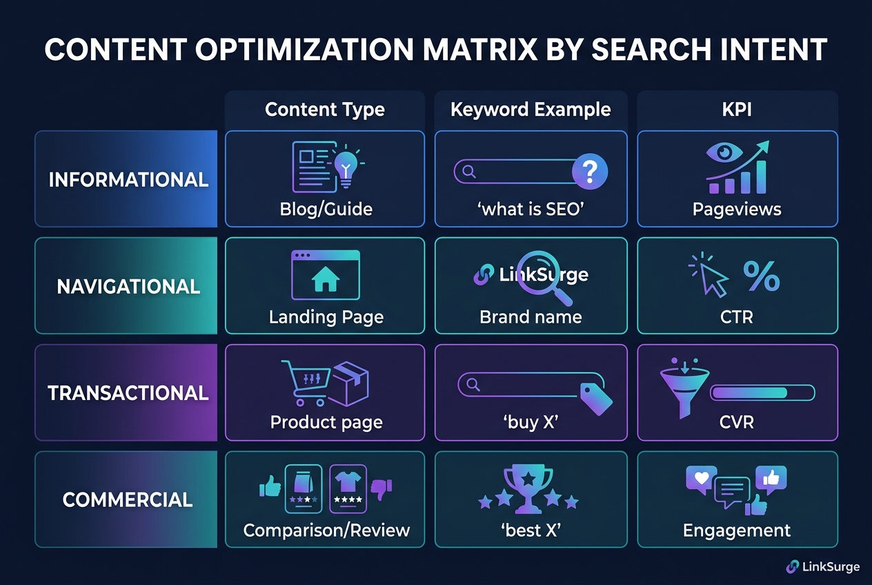 - Each intent type requires a different content format — Blog posts for informational, product pages for transactional, comparison articles for commercial investigation