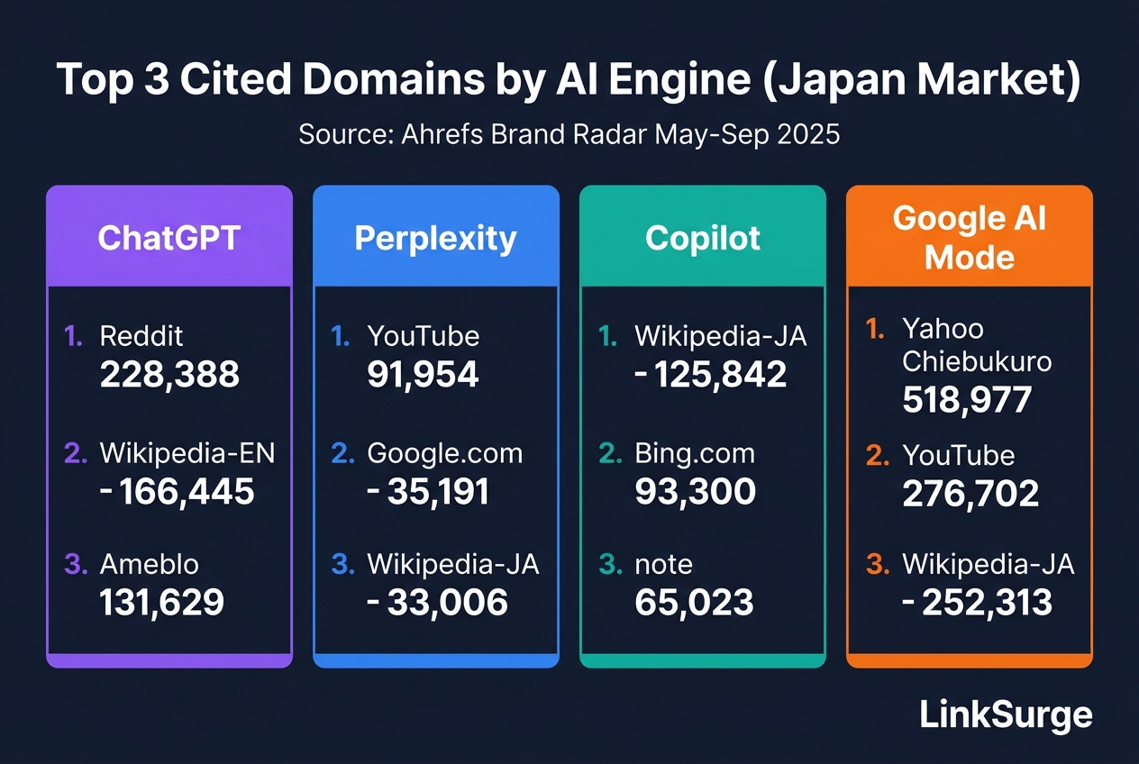 When I dug into AI-search source data, Ahrefs' 2025 Japan-market study stopped me in my tracks. In Japan, ChatGPT's most-cited source is Reddit (228,388 times), and Google AI Mode cites Yahoo!知恵袋 (Yahoo Answers Japan) 518,977 times — two-to-five times any other source across any other AI engine. What this means in plain terms is simple: AI engines aren't primarily feeding on corporate sites and news media. They're feeding on user-generated content. Here's what struck me after reading this alongside the English-market research: