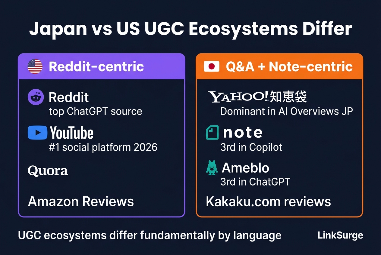 - UGC ecosystems are fundamentally different by language — English-side is Reddit / YouTube / Quora-centric; Japanese-side is Yahoo!知恵袋 / note / Ameblo-centric. Japan expansion without Japanese UGC investment is essentially invisible to Google AI Mode.