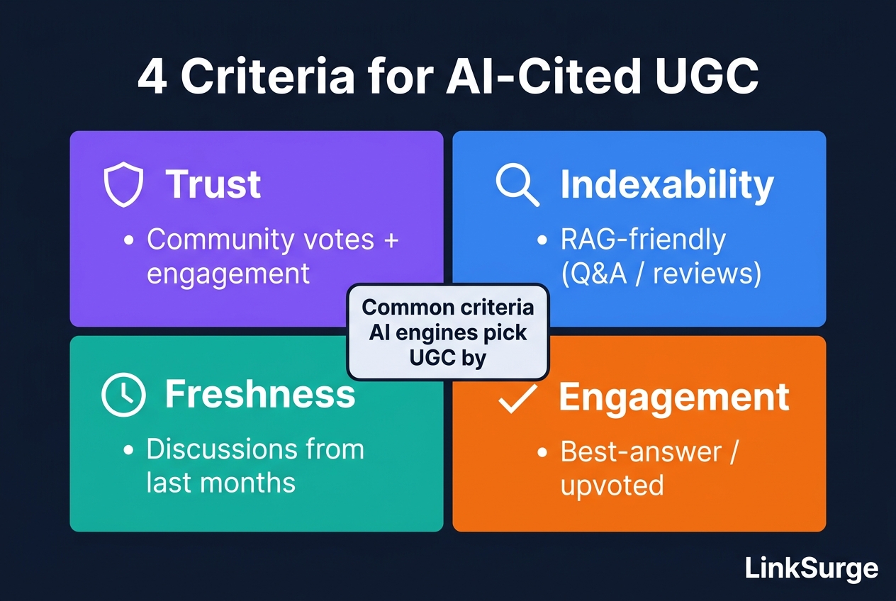 Ahrefs' analysis boils AI's UGC-selection logic to four axes. Understand these and the next section's tactics make more sense: