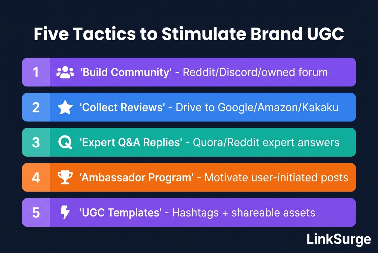 - Brands "stimulate" UGC — they don't fabricate it — Self-generated UGC gets flagged as spam. Community building, review solicitation, expert Q&A answers, ambassador programs, and UGC templates are the five tactics that create the conditions for organic UGC.