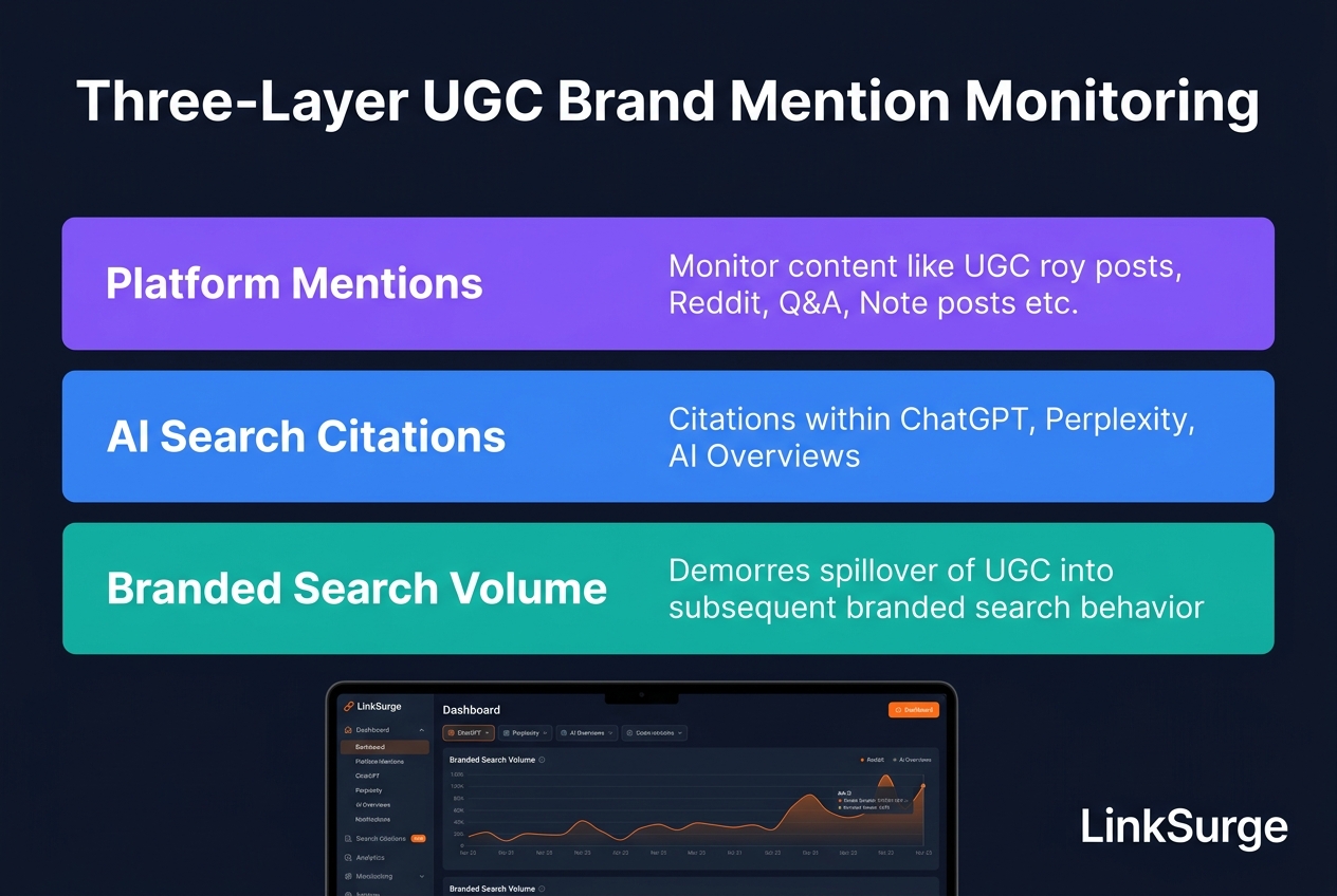 LinkSurge's brand mention tracker tracks daily brand citations across ChatGPT, Perplexity, and Google AI Mode. Pair it with the checklist above when you want to quantitatively validate UGC tactics.