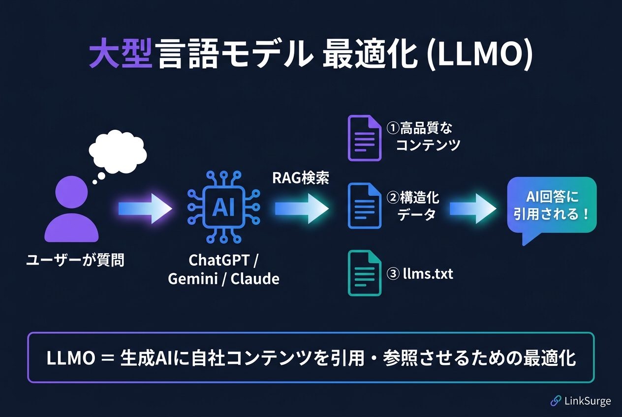 LLMOが目指すのは「AIの回答内での引用・ブランド露出」です。ユーザーがAIチャットに質問したとき、AIの回答の中に「〇〇社によると...」「参照:linksurge.jp」といった形で自社コンテンツが登場する状態を作ることが目的です。