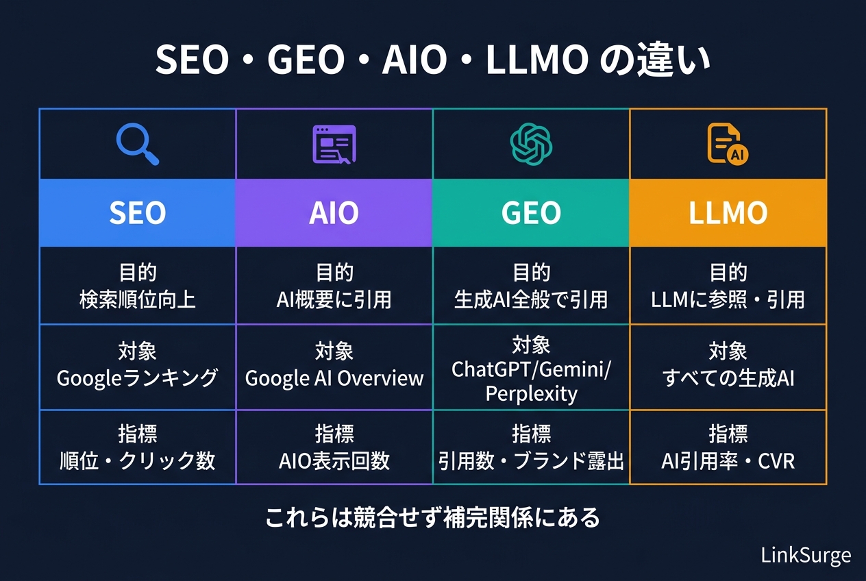 2. SEO・GEO・AIOとは目的が少し違う — 従来のSEOが検索順位やクリック数を目標とするのに対して、LLMOはAIの回答内での「引用・ブランド露出」を直接の成果指標とします。ただし、これらは競合せず補完関係にあります。