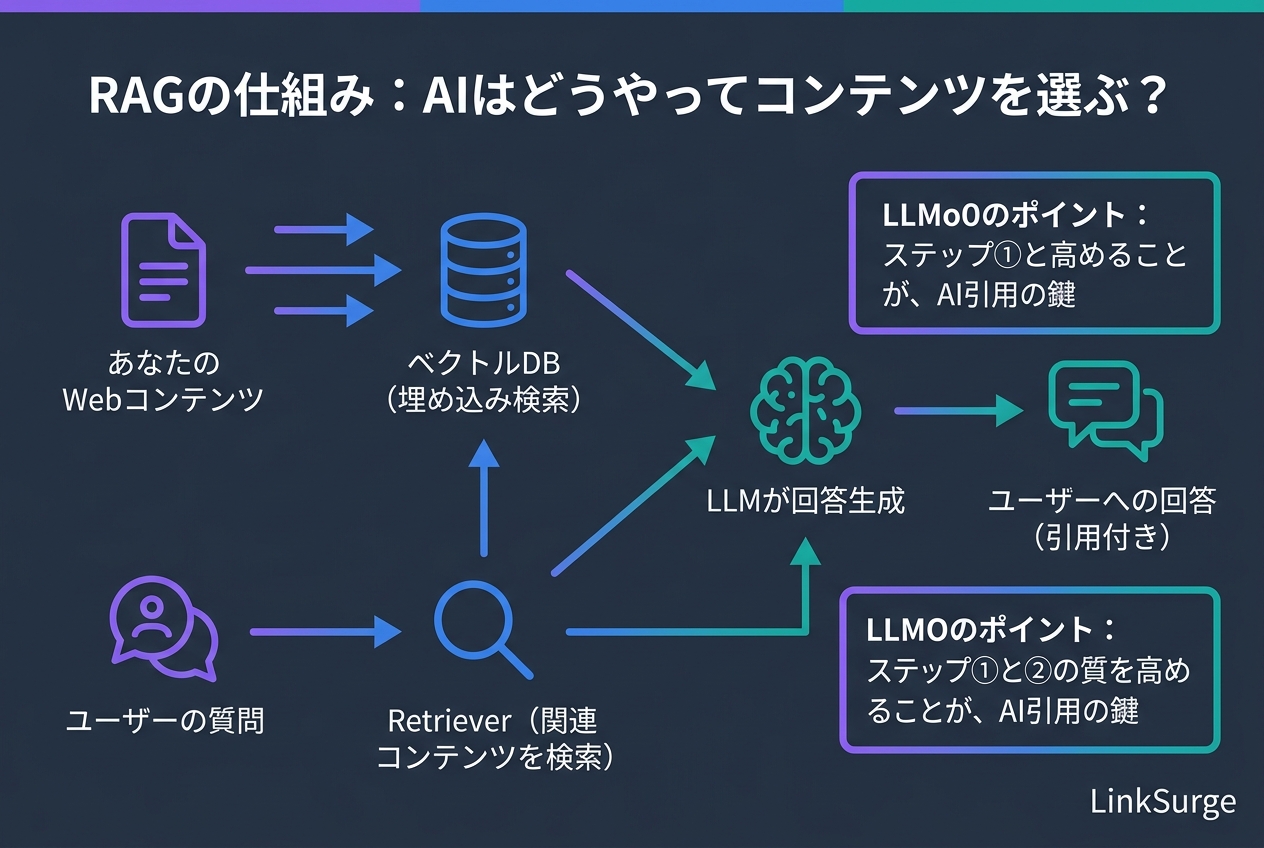 これを理解するためには、RAG(Retrieval-Augmented Generation、検索拡張生成) という技術を知る必要があります。RAGはLLMOを理解する上で最も重要な概念の一つです。