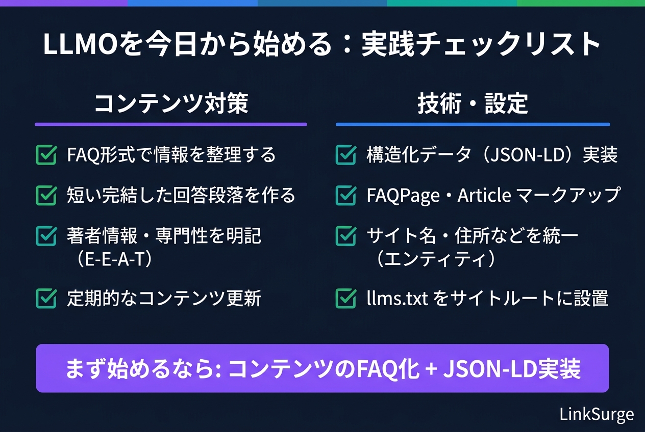 4. 今すぐできることから始められる — 高額な技術投資は最初は不要です。FAQコンテンツの整備、構造化データ(JSON-LD)の追加、著者情報の明記など、無料または低コストで始められる施策があります。
