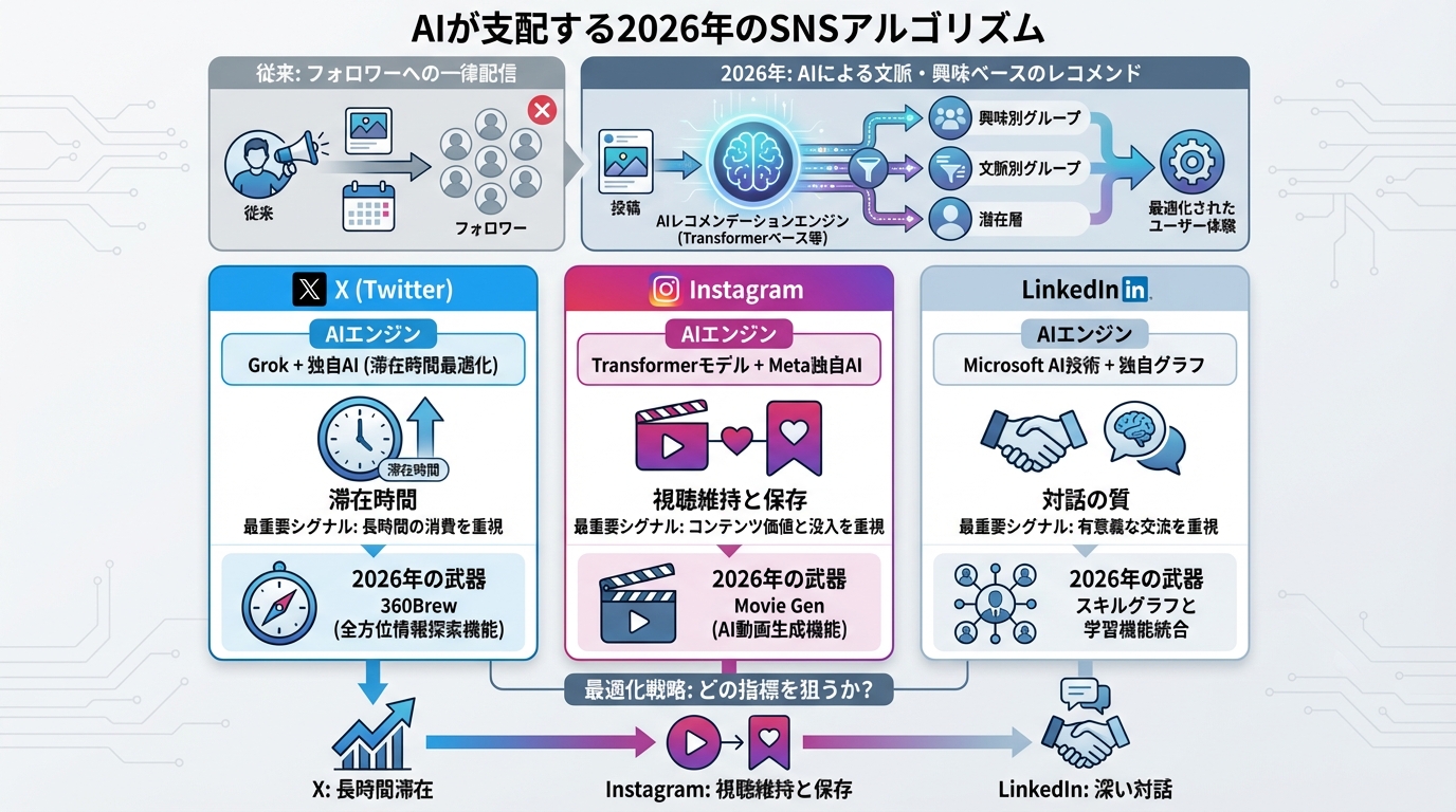 2026年現在、X・Instagram・LinkedInの3大プラットフォームは、いずれもTransformerベースの大規模言語モデルや独自のAIシステムをレコメンデーションエンジンに採用しています。