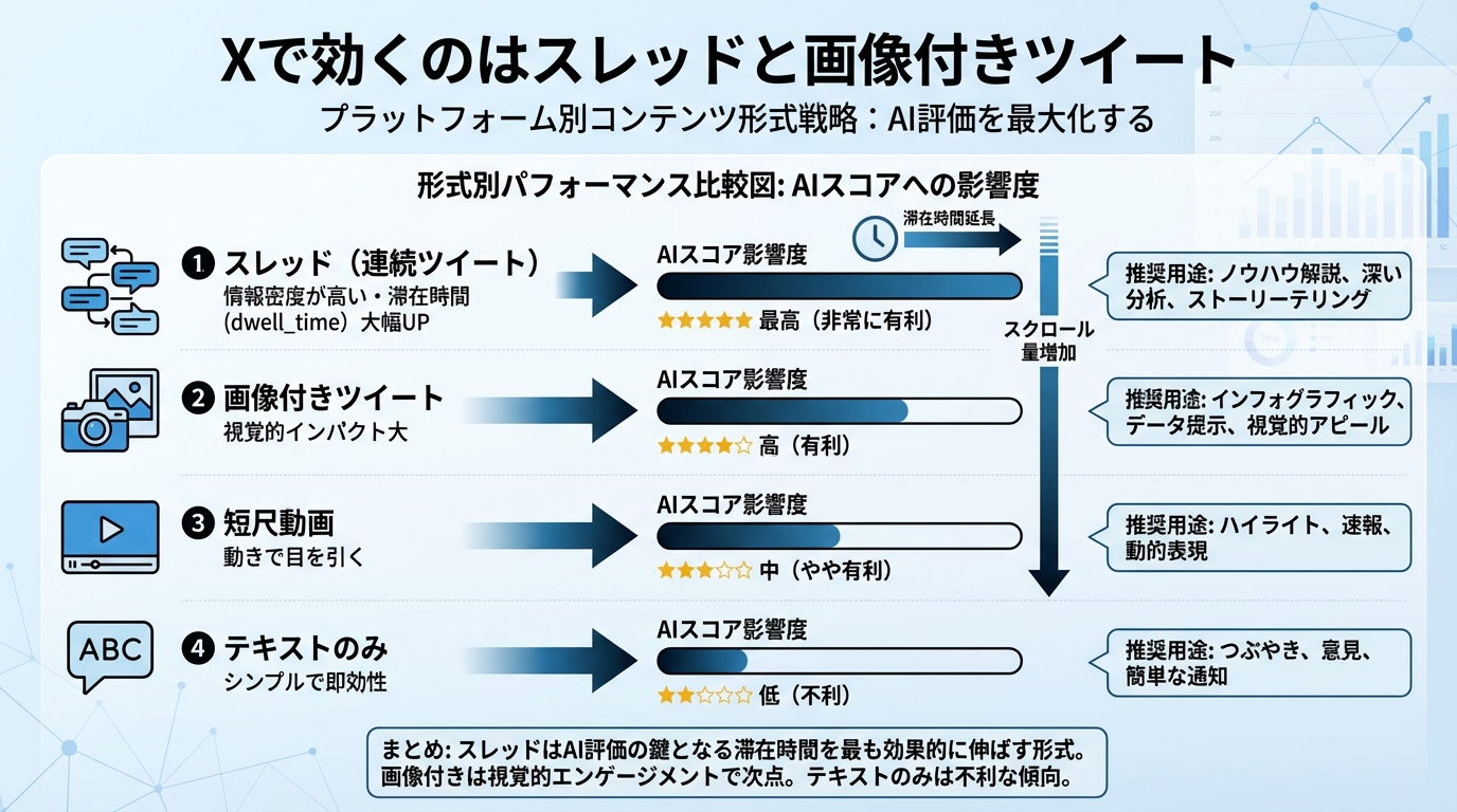 Xでは情報密度の高いスレッド(連続ツイート)が最も効果的です。理由は単純で、スレッドはユーザーの滞在時間を伸ばすから。1ツイートでスクロールされるよりも、5〜10連投のスレッドを最後まで読んでもらうほうが閲覧秒数は大幅に上がります。