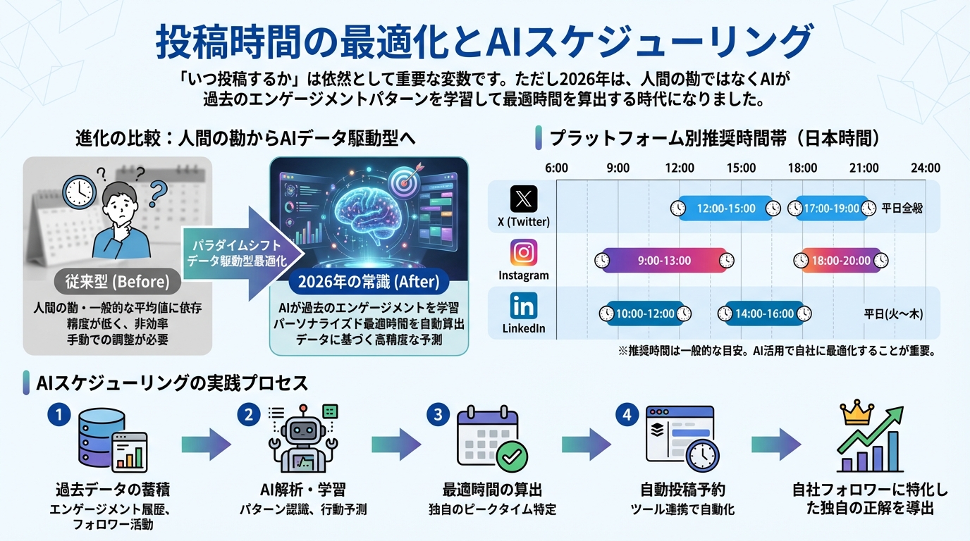 「いつ投稿するか」は依然として重要な変数です。ただし2026年は、人間の勘ではなくAIが過去のエンゲージメントパターンを解析して最適時間を割り出す時代です。