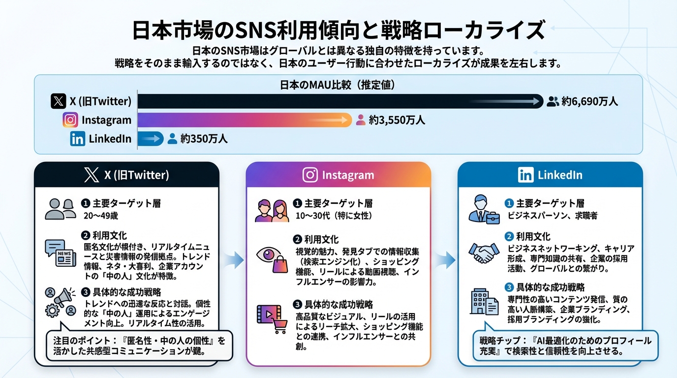 海外の成功事例をそのまま輸入しても日本では通用しないケースがあります。日本のSNS市場にはグローバルとは異なる独自の特徴があり、ローカライズの精度が成果を左右します。